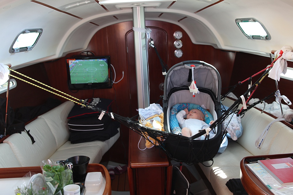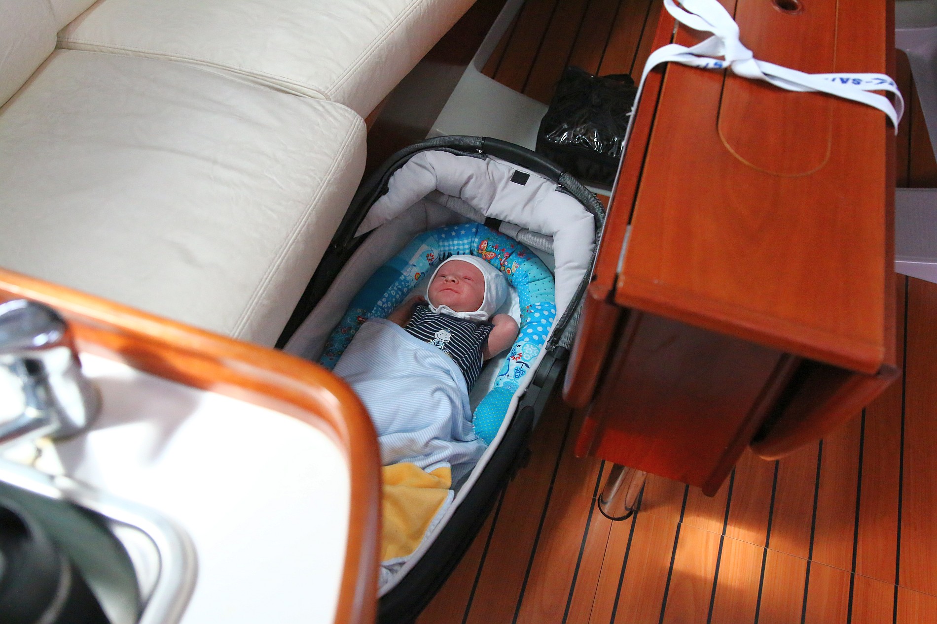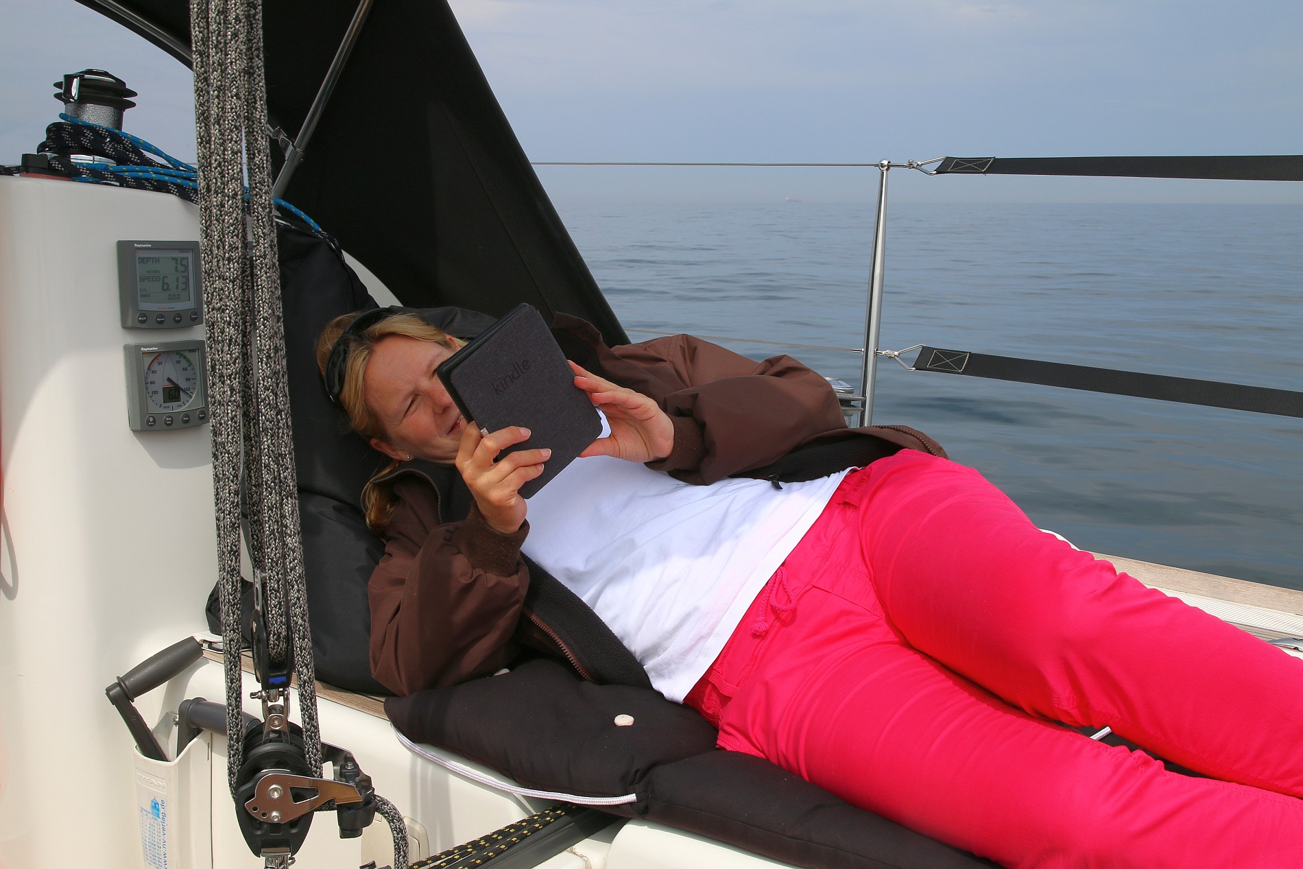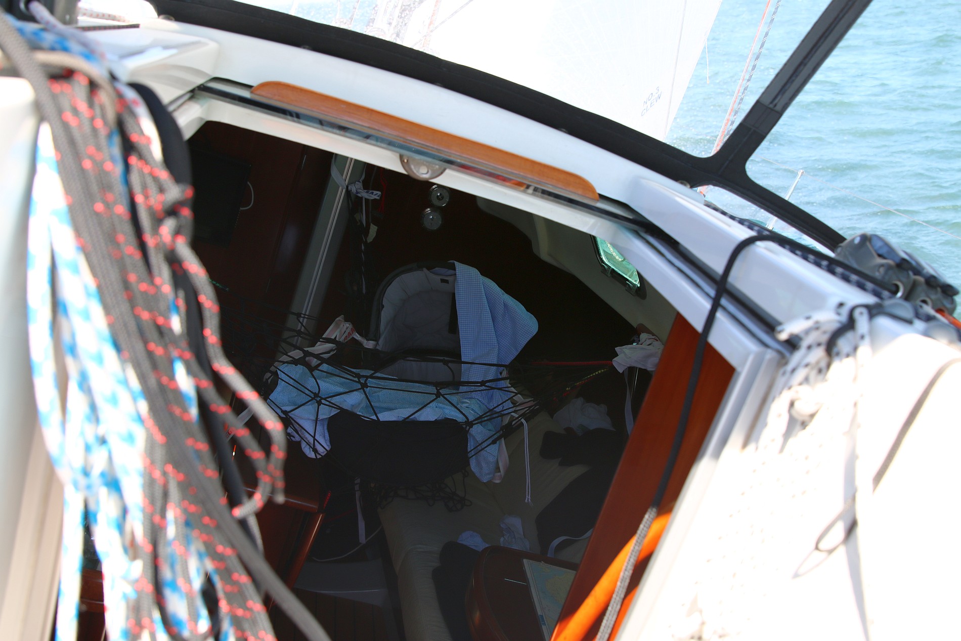 Finn wandert im gleichen Zug vom Cockpit wieder zurück in seine kardanische Aufhängung unter Deck. Sein Gesichtsausdruck bleibt dabei unverändert fröhlich.