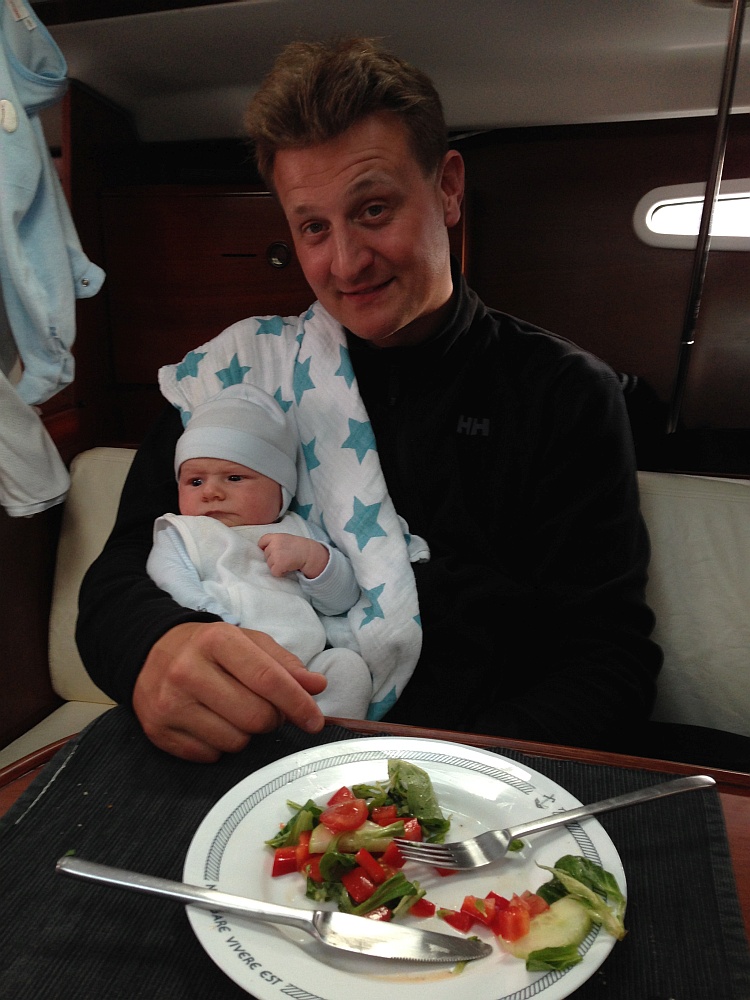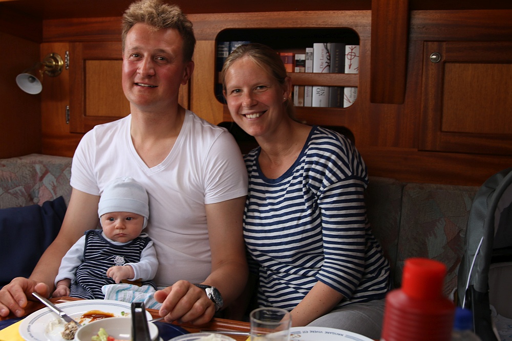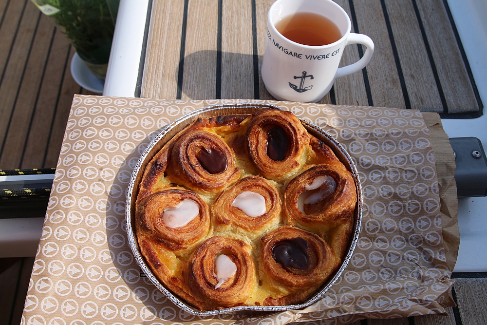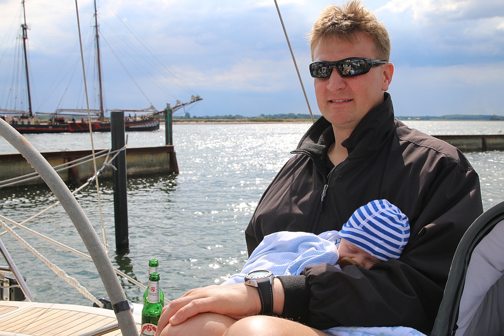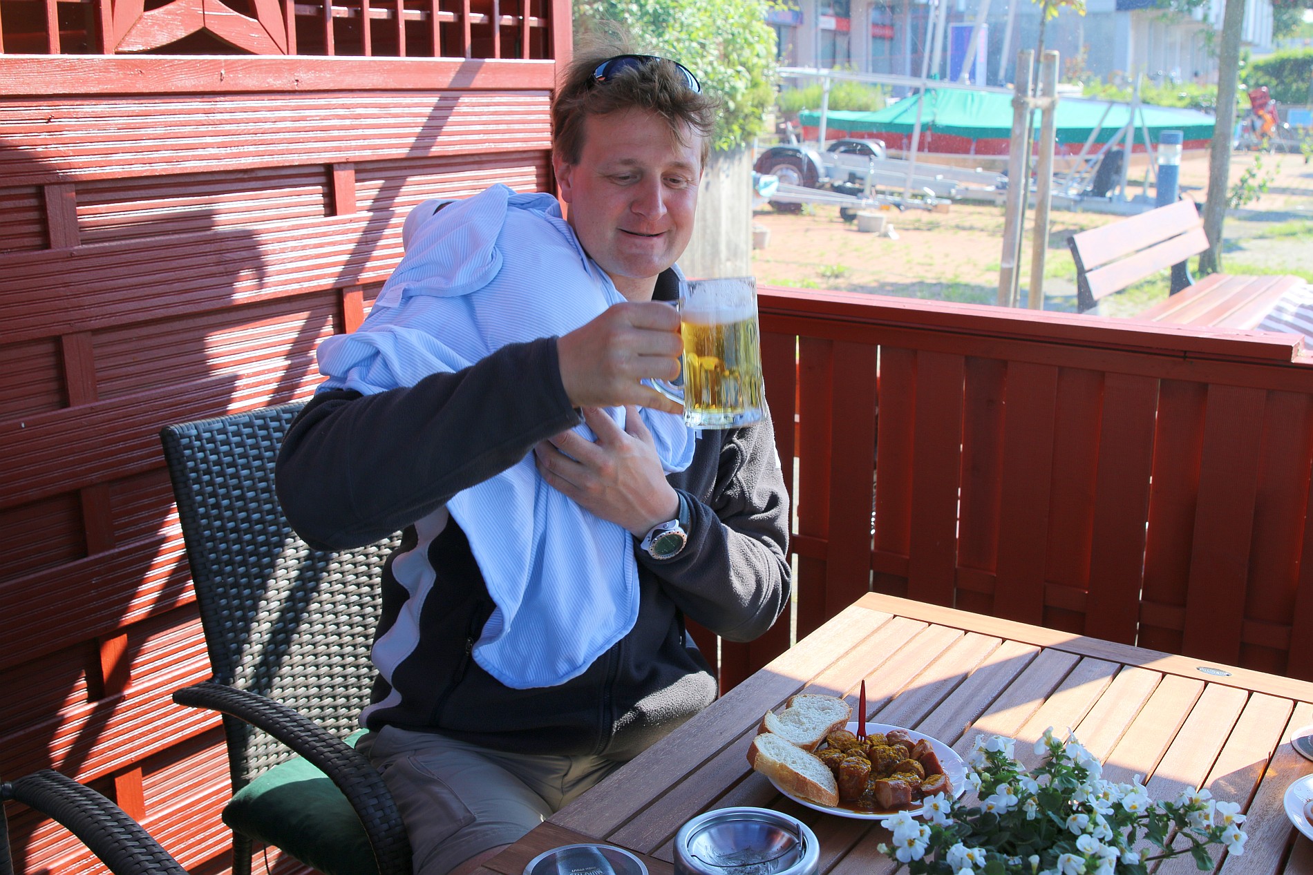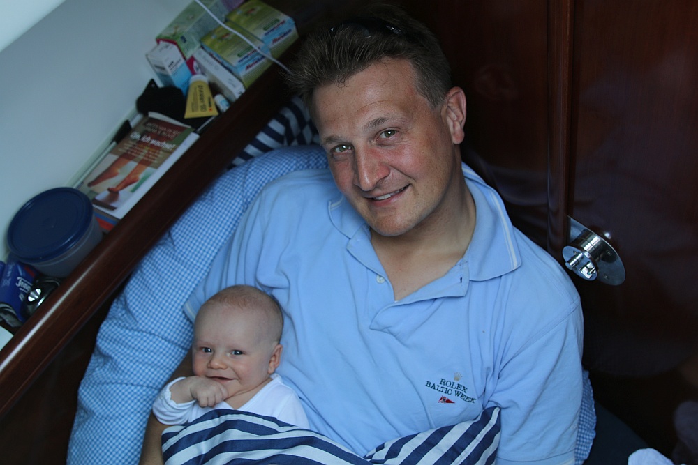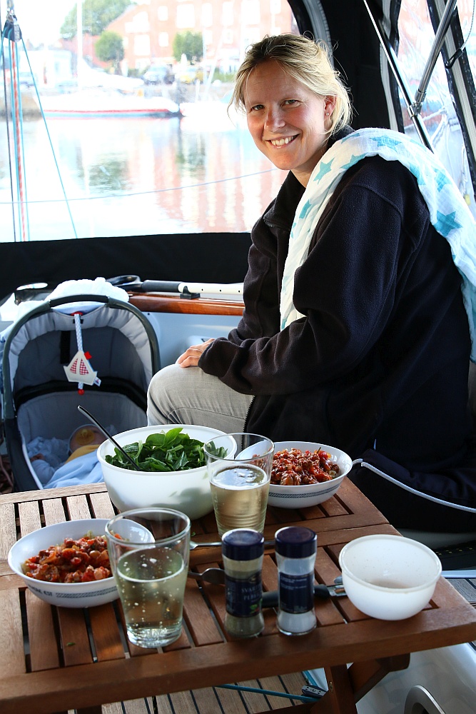 Lars beginnt den Tag mit einem Bad in der Ostsee, im Anschluss gibt es ein leckeres Frühstück im Cockpit – das Baby schläft immer noch :o) Zum ersten dänischen Frühstück gehört für mich: