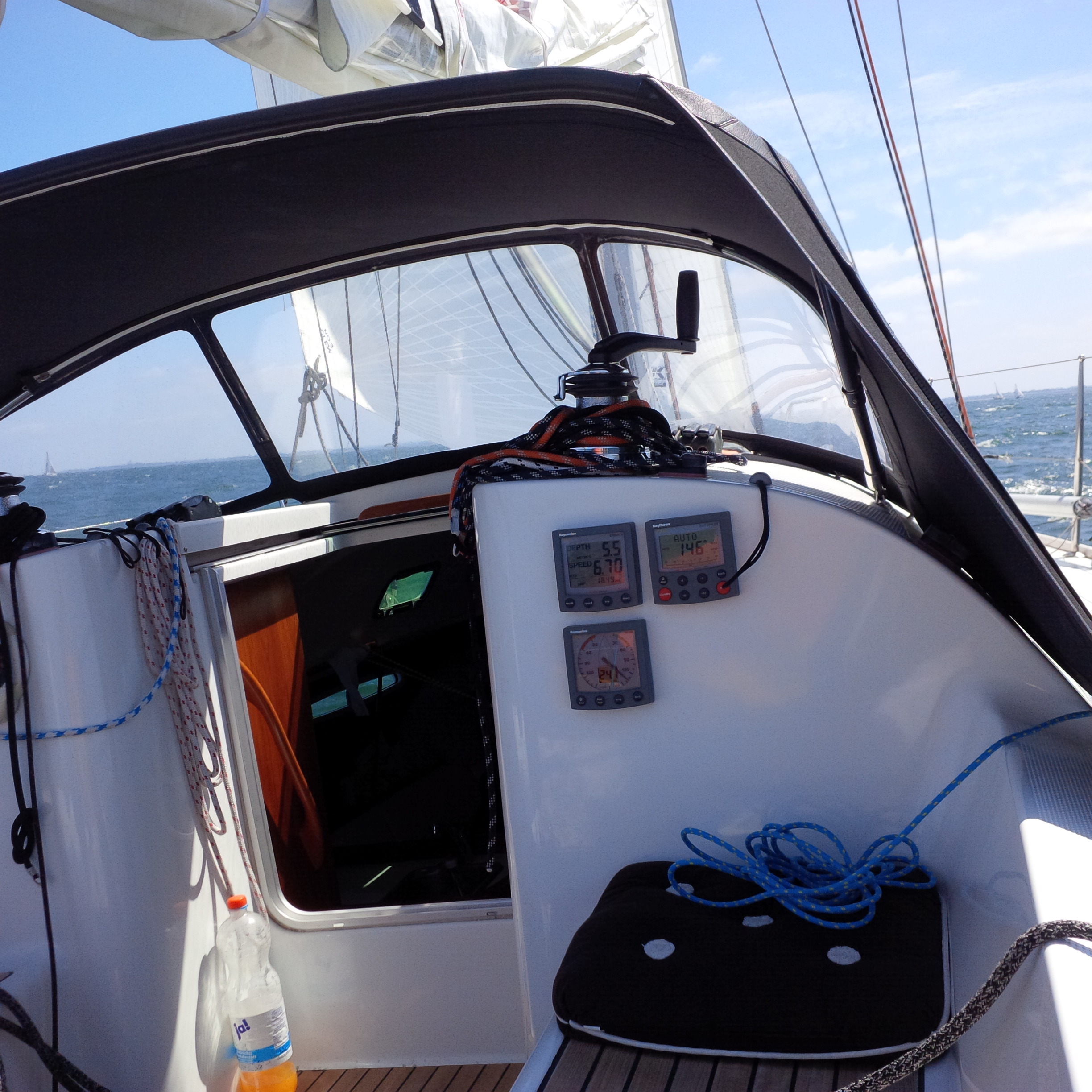 13:40 Uhr, der Wind hat auf 14-18kn zugenommen. Wir ziehen das erste Reff ins Groß und sind mit der Genua weiterhin zügig unterwegs.
