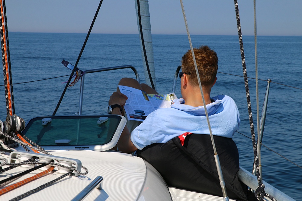 12:50 Uhr, der Wind ist zwar nicht mehr, aber spitzer geworden. Bei ca 9kn Wind können wir gut mit Genua und Groß segeln und dem Motor endlich seine verdiente Pause gönnen.