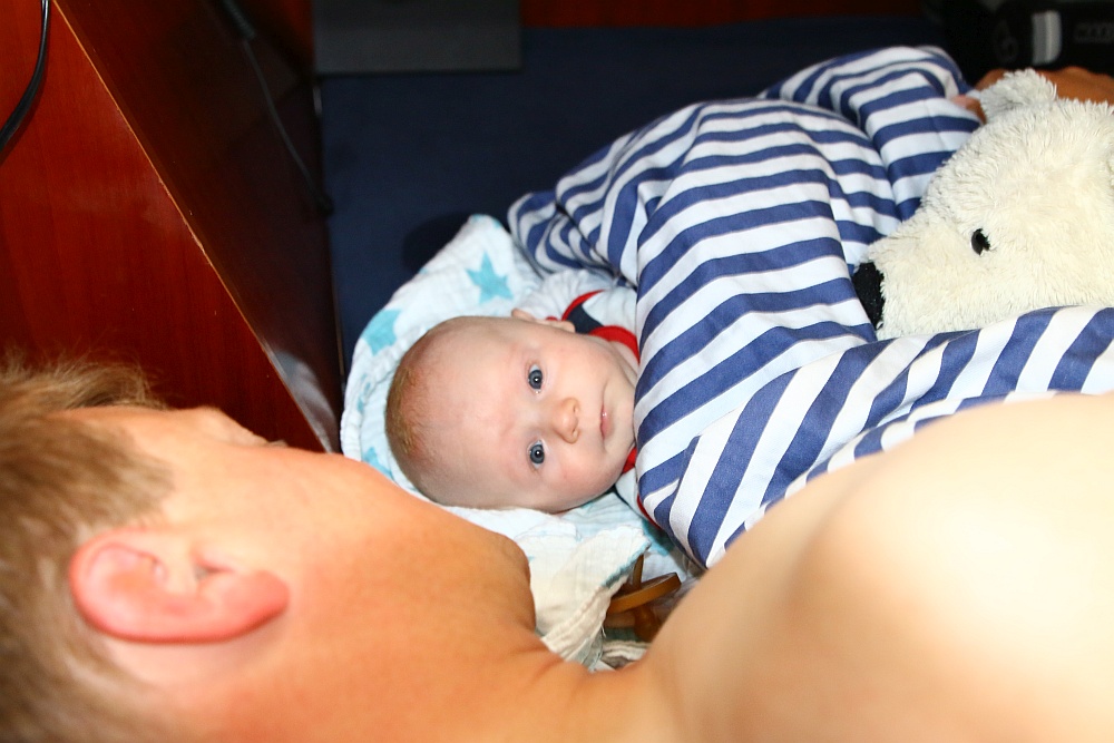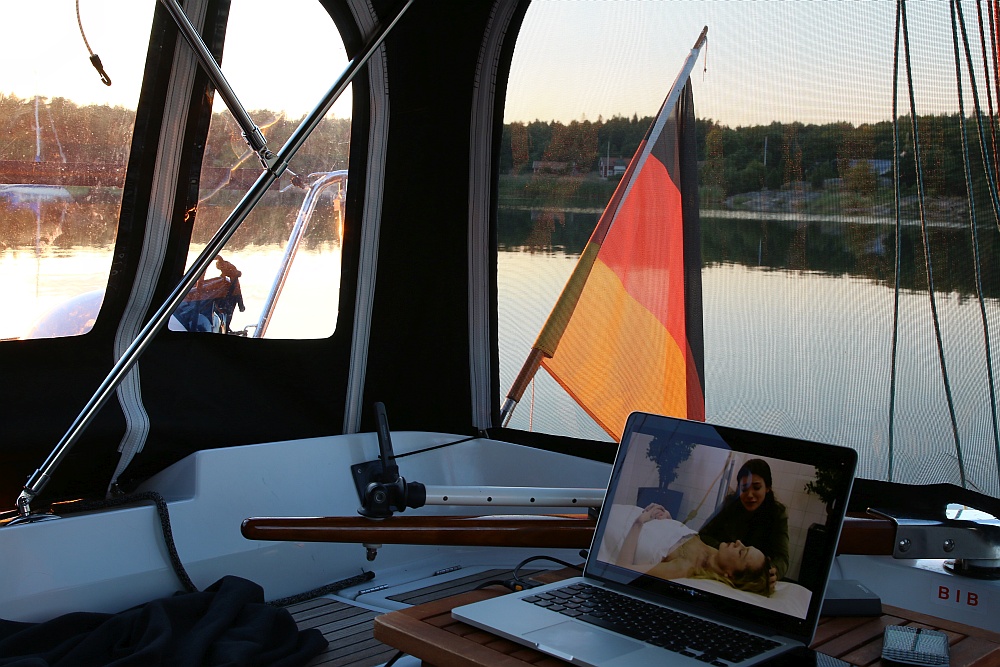 Das erste Abend-Schläfchen von Finn dauert ca. 2-3h. Heute haben wir in der Zeit lecker gegessen und noch einen Tatort im Bordkino geguckt.