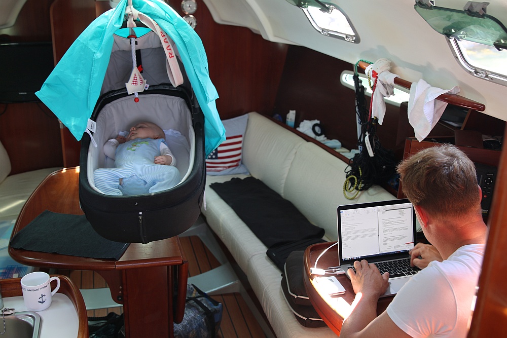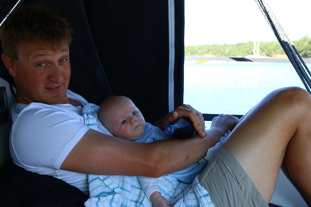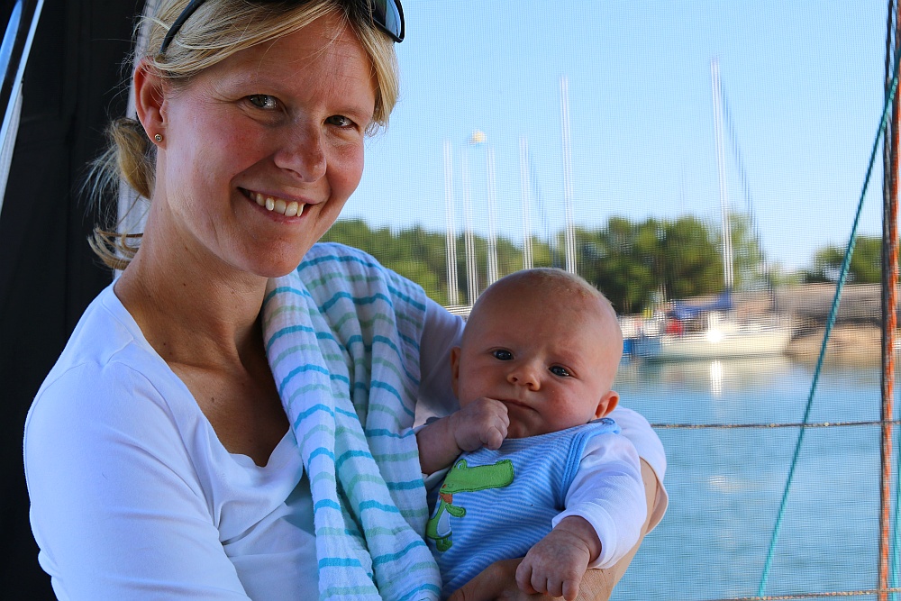 Als das Baby unter Deck schläft gehen beide Eltern baden.