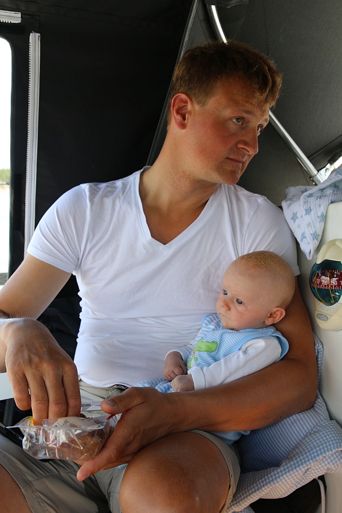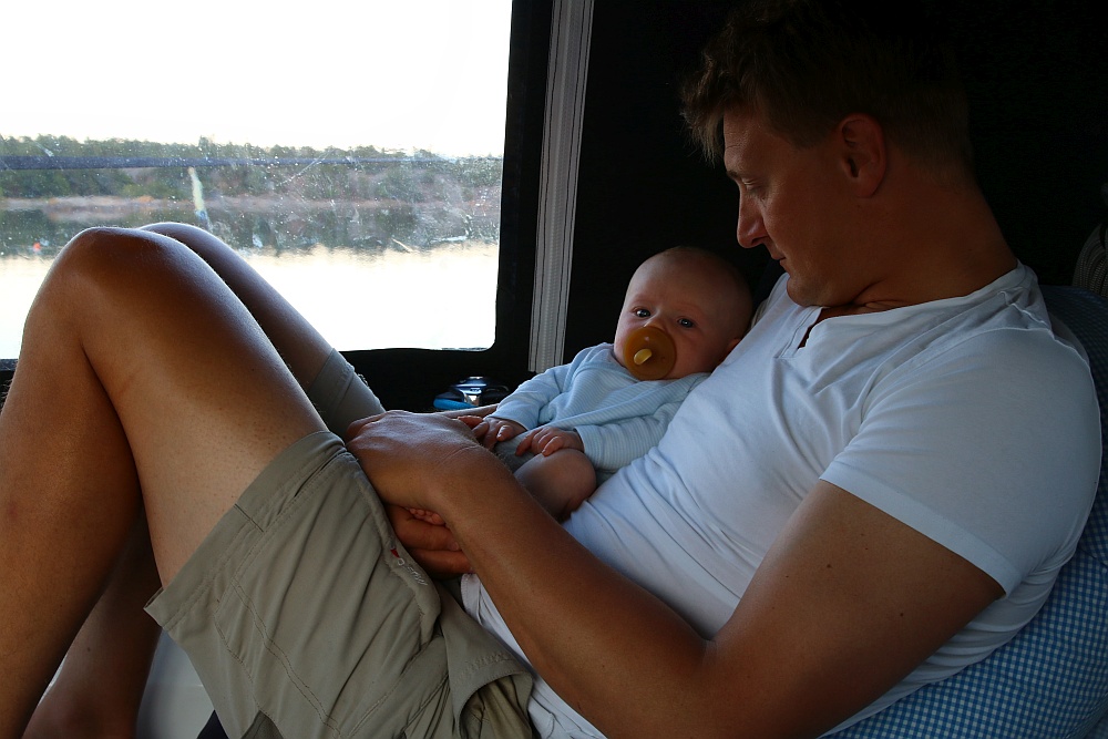 Ab ca. 21h starten wir dann mit Finns Abendritual, d.h. er bekommt etwas zu Essen, anschließend folgt der „Lars-und-Finn-Wickel-Wasch-Spaß“, der damit endet, dass ich einen gut duftenden Finn im Schlafsack für einen kleinen Gute-Nacht-Schluck gereicht bekomme.