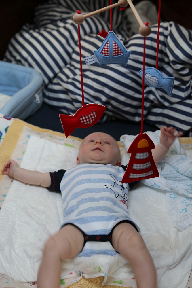 Bei uns beginnt der Tag ruhig. Finn legt erstmal die erste Spiel- und Strampel-Session unter seinem Mobile ein.