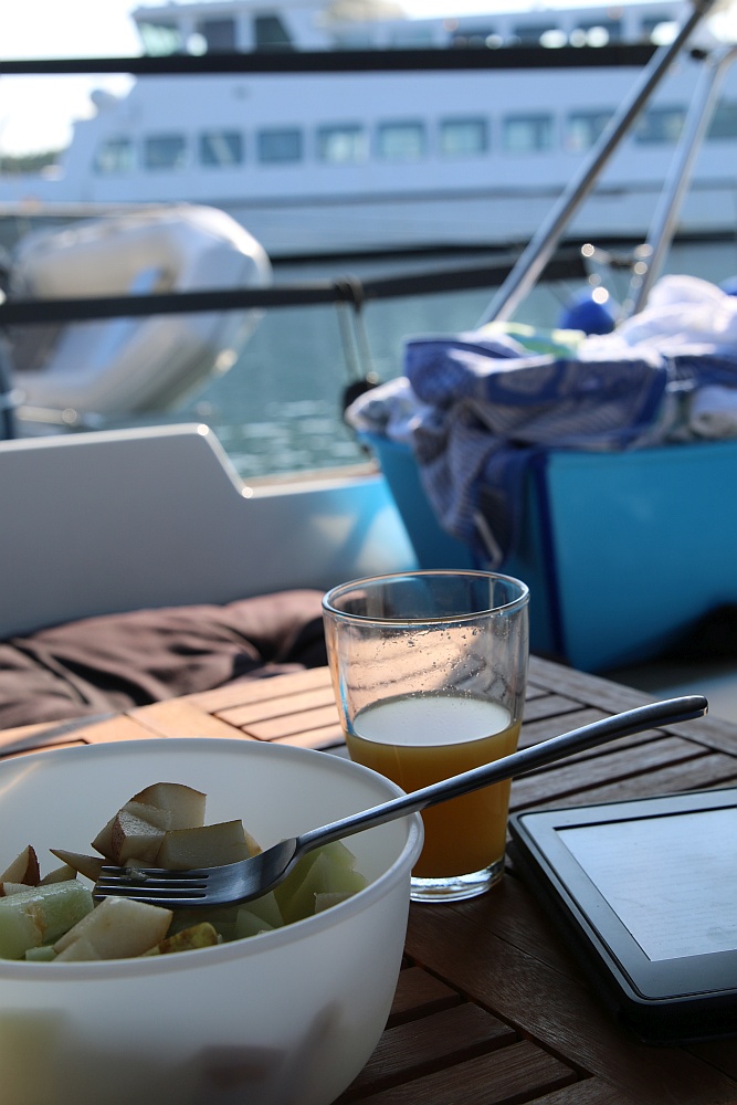 Finn und ich haben uns noch einmal umgedreht und weiter geschlafen. Wir sind erst um 8h aus der Koje gestiegen. Auf dem Handy erwartete uns schon die erste Nachricht von Lars. Er hat den Flughafen super gut erreicht und bereits den Starbucks direkt vor seinem Gate geplündert. ;o)