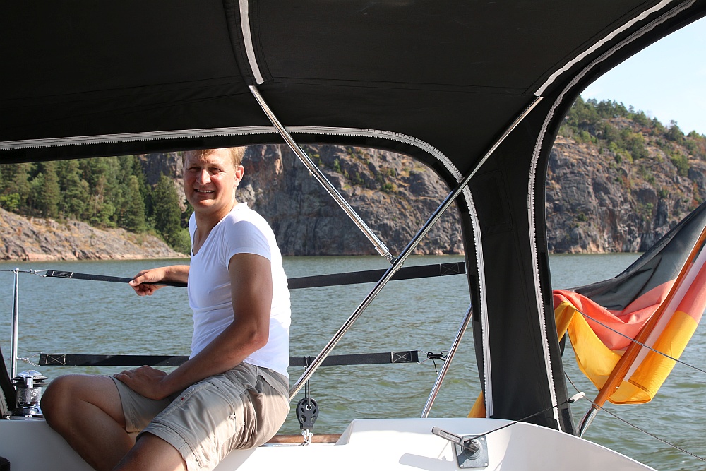 Wir haben unsere Kuchenbude aufgebaut und nutzen sie (ohne Seitenteile) als Bimini-Top – ohne Schatten würden wir eingehen, außerdem kann Finn so bei uns im Cockpit sein,
