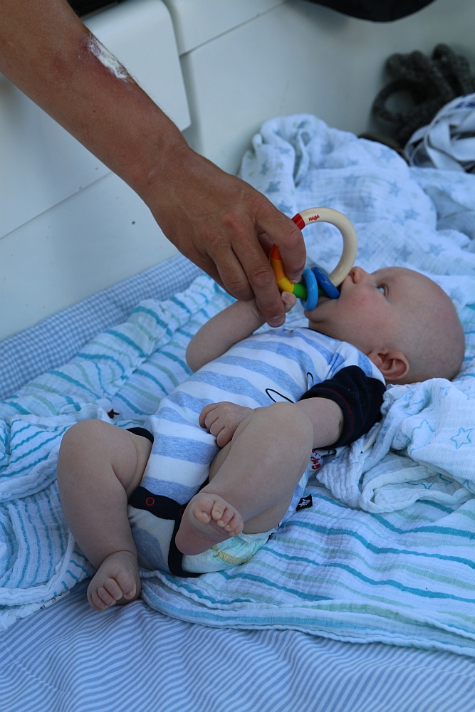 Ein aufregender Tag mit vielen Erlebnissen geht zu Ende. Lars macht jetzt das Abendritual mit Finn, dann kommt das kurze Crewmitglied ins Bett und es verbleibt noch etwas „Elternzeit“ – sehr schön!