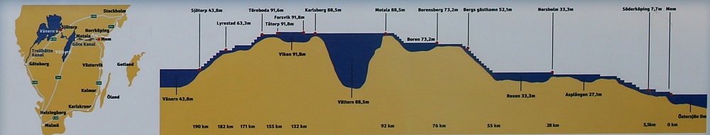 Er erstreckt sich von Mem bis Sjötrop im Vänernsee und verbindet zusammen mit dem Trollhätte Kanal Stockholm mit Göteburg.