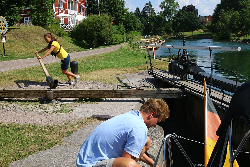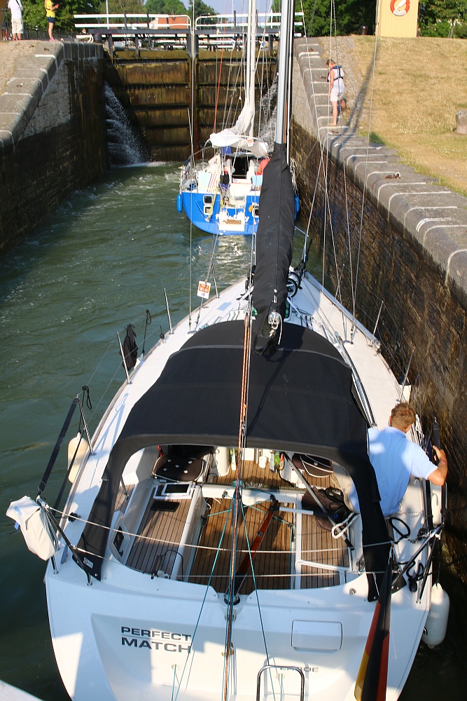Doch dann ging alles ganz schnell. Der Großsegler vor uns ist von seinem Schleusenplatz zurückgetreten, da ein Gast noch in der Dusche war.