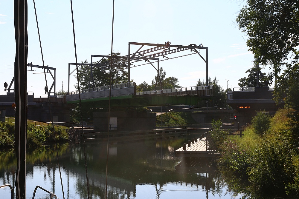 Wir legen an dem Steg an und plötzlich spricht eine Stimme aus dem Off zu uns und bittet uns, auf zwei nachfolgende Schiffe zu warten, da die Eisenbahnbrücke nicht zu oft geöffnet werden soll.