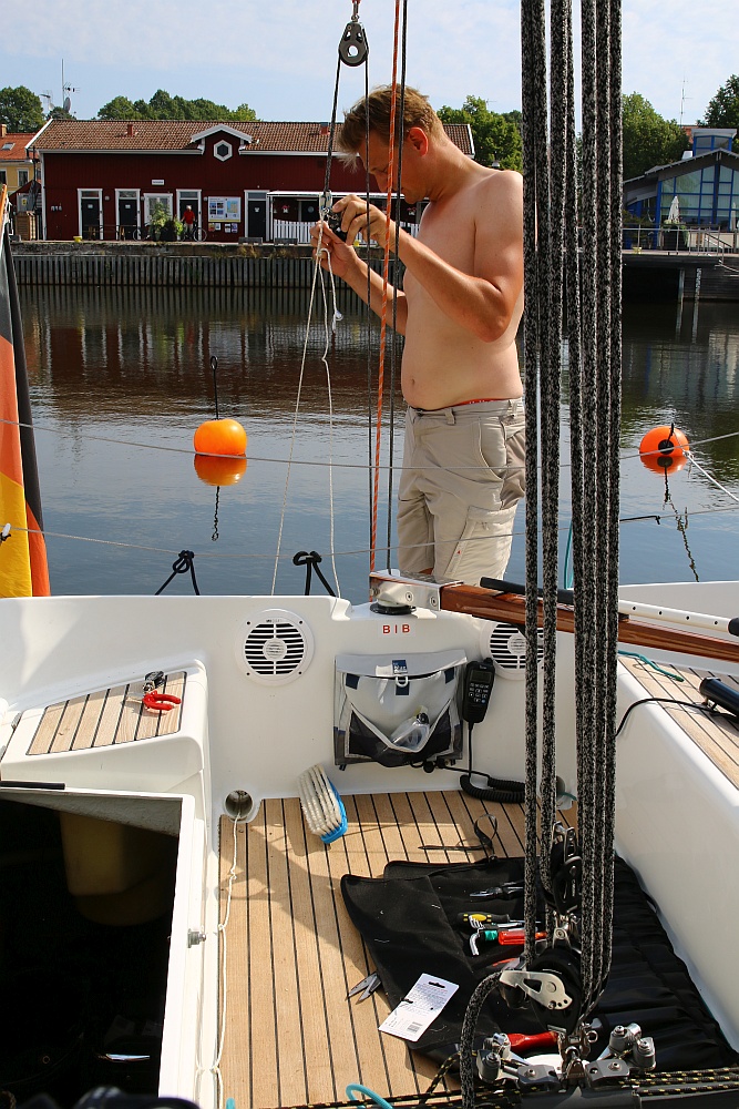 Danach dauert es heute noch etwas bevor wir auslaufen können. Der Ausrüster hier vor Ort ist super sortiert. Lars nutzt die Chance und baut unseren Achterstagspanner um. Nein, wir tauschen nicht nur die Farbe von Mint-Grün *bäh* zu Weiß-Schwarz *yeah*, sondern wir erhöhen auch die Übersetzung, so dass auch ich das Achterstag problemlos bedienen kann.