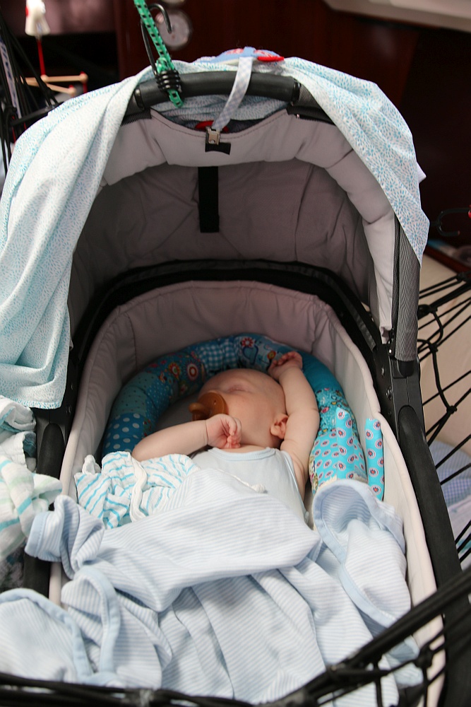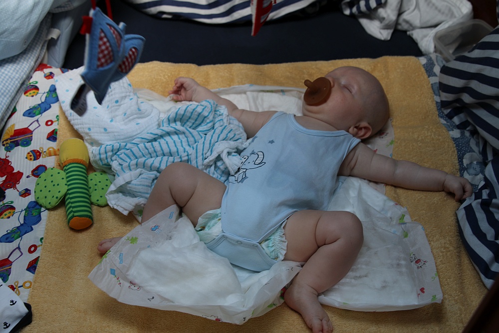 Finn konnte ich schlafend in seine Babywanne heben. Bei der Hitze hat er keine Energie zum Aufwachen :o)