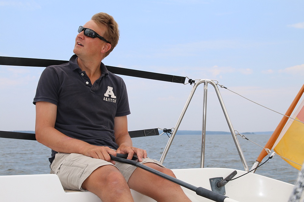 Dann geht es endlich aufs Wasser. Ein schöner Segelwind von 8kn bläst uns hoch am Wind, aber ohne Welle zu unserem Ziel.