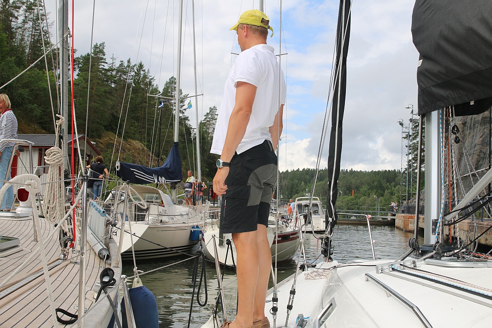 Lars hilft dann aber bei dem Schiff an der Schleusenwand mit dem Abhalten, Leinen führen etc.