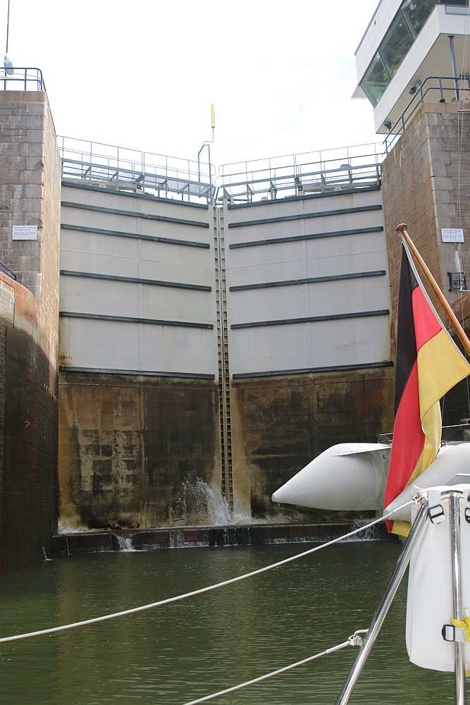 Bei der letzten Schleuse kommen uns direkt in der Schleusenkammer Schiffe entgegen. Jetzt verstehen wir auch die Vorschrift, das 25% der Wasseroberfläche beim Schleusen freibleiben muss. Diese Fläche wird zum Rangieren benötigt.