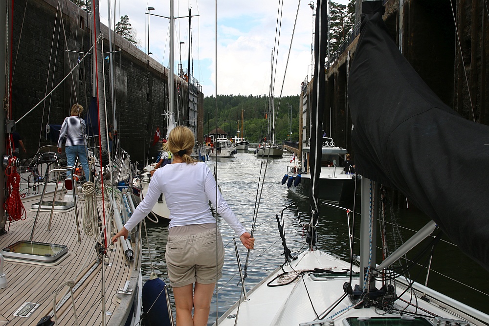 Wir liegen, da wir zu den kleineren Schiffen zählen, meist außen oder in der Mitte der Päckchen. Nie direkt an der Schleusenwand.