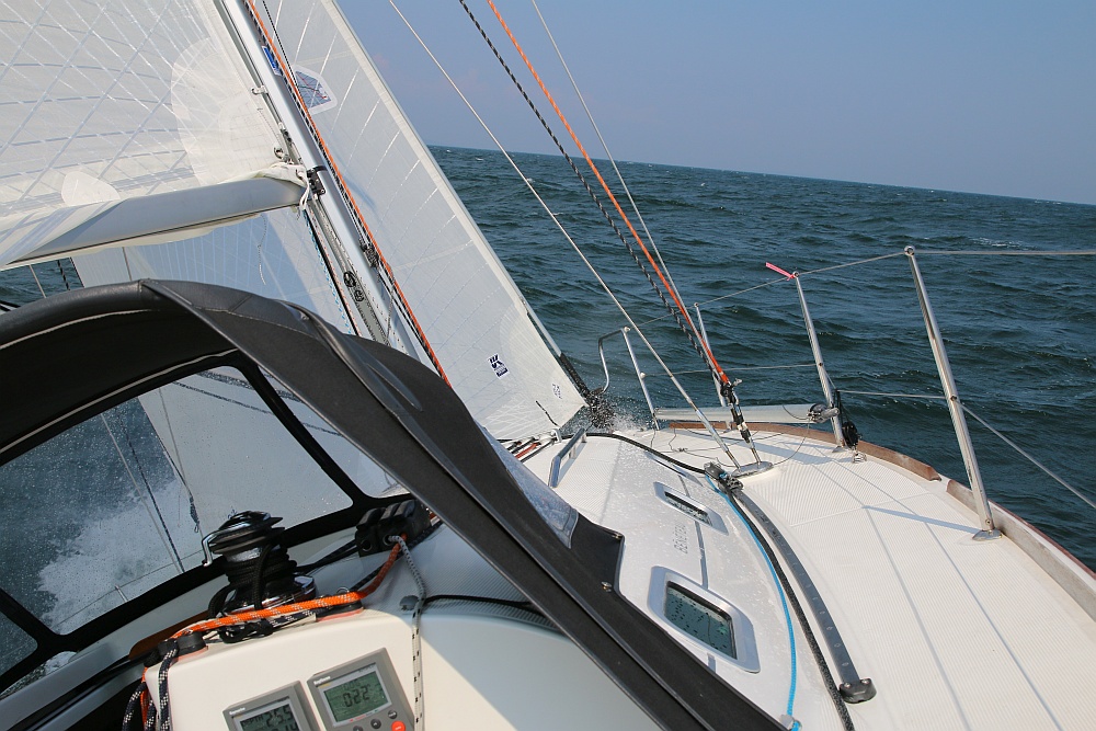 14:00h, der Wind hat wieder ein Stück zurück gedreht. Bei 18kn Wind ziehen wir das Groß mit einem Reff und rollen die kleine Genua wieder aus. Die 228 Grad nach Hanö treffen wir fast. Traumhaftes Segeln bei wieder blauem Himmel und kurzer Hose.