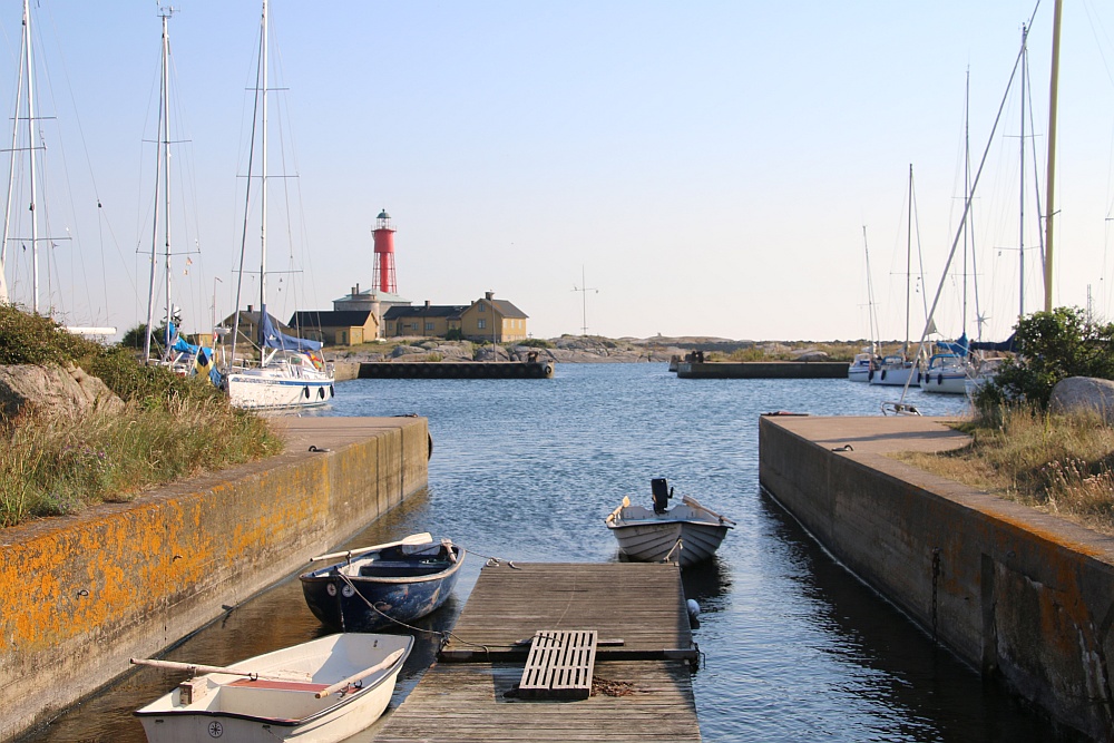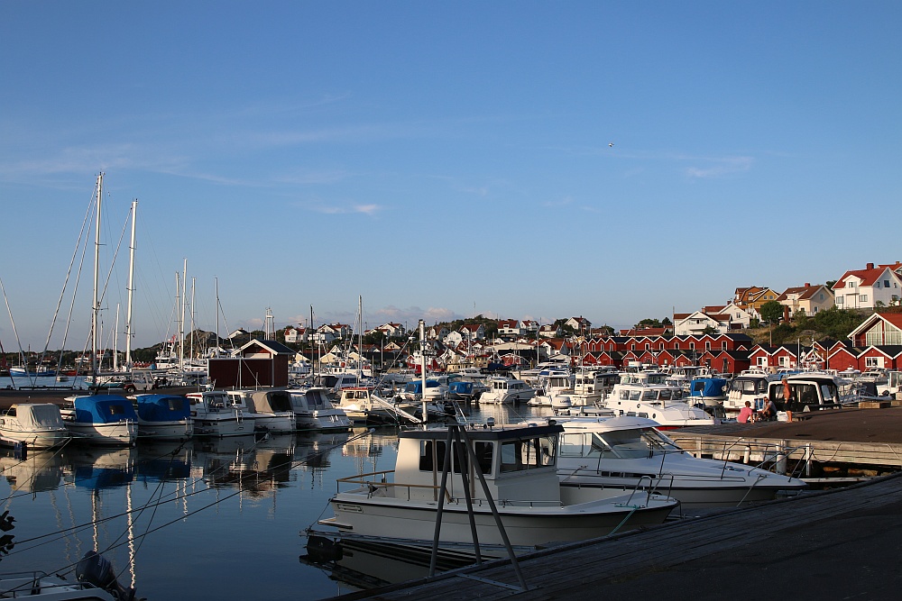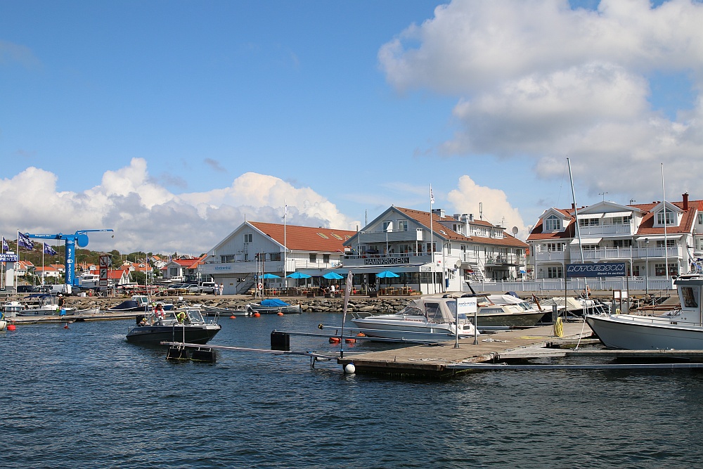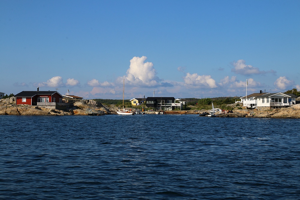 Donsö ist, zumindest hier unten im Hafenbereich, eine autofreie Insel. Die Straßen, oder sollte ich lieber sagen, die Wege sind hier so schmal, dass die Inselbewohner hier nur Elektroautos, Golfcars oder Mopeds nutzen.