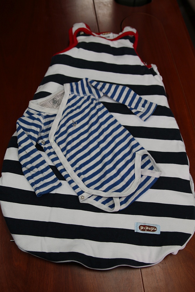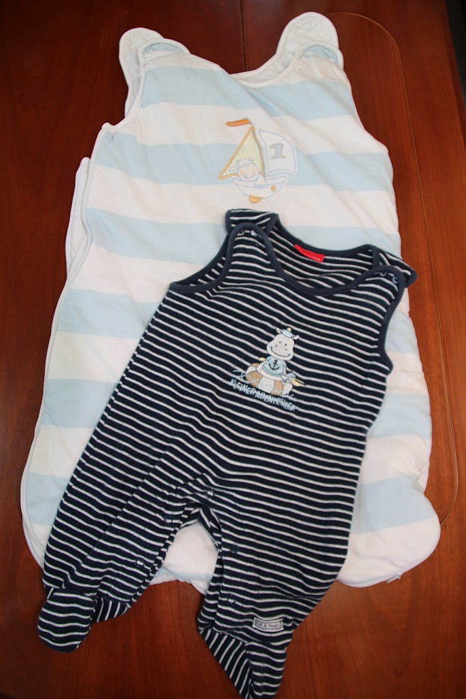 Finn ist wieder aus zwei unserer Lieblingsstücke herausgewachsen. Der kleine Seemannsbody von Lis, Ralph und Silke – er sah darin immer zum Knutschen süß aus – und der Schlafsack, den er von Lars bekommen hat bevor er geboren wurde. Lars hat mich und Heidi auf eine Babymesse begleitet, zum Glück hat er es überlebt. *zwinker* Dort hat er Finn diesen Schlafsack gekauft.