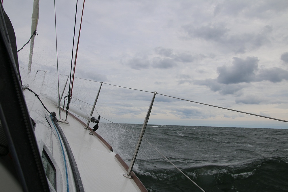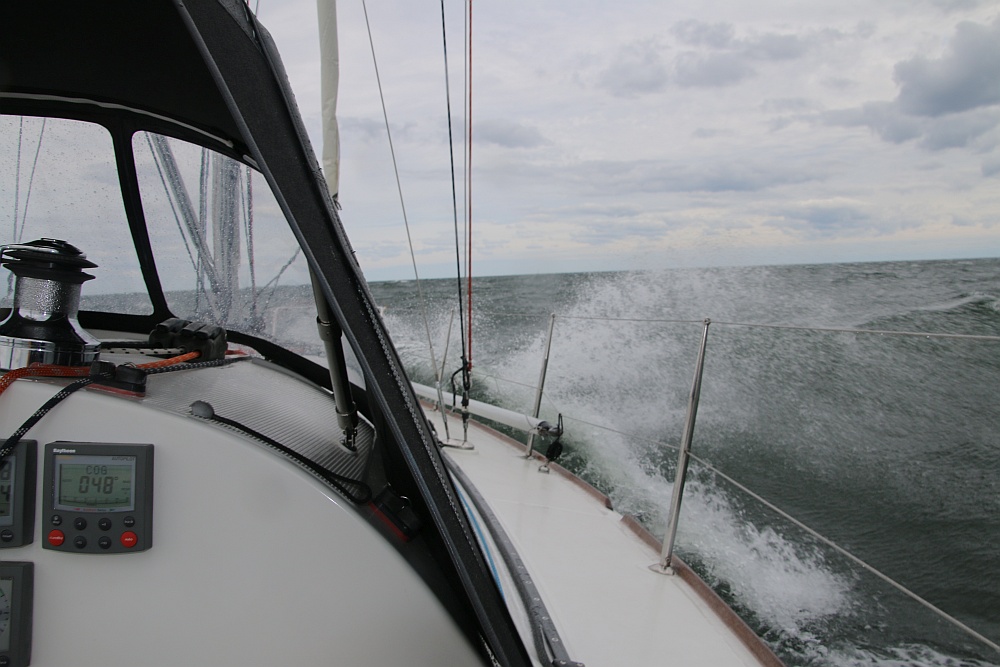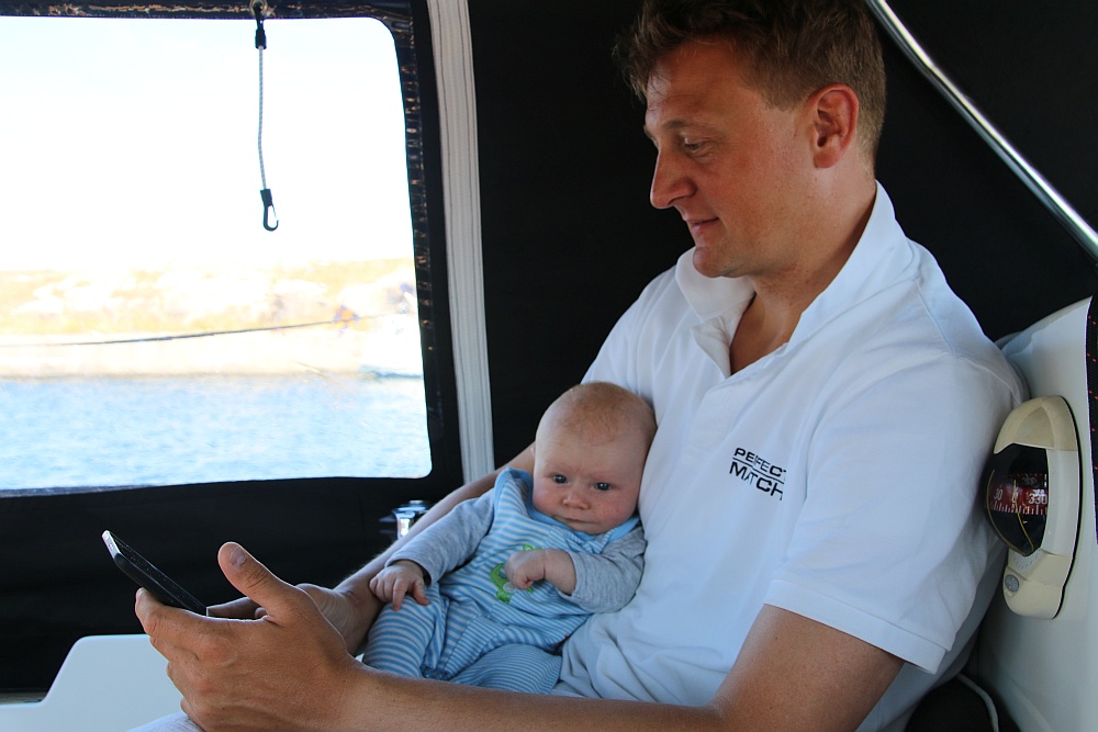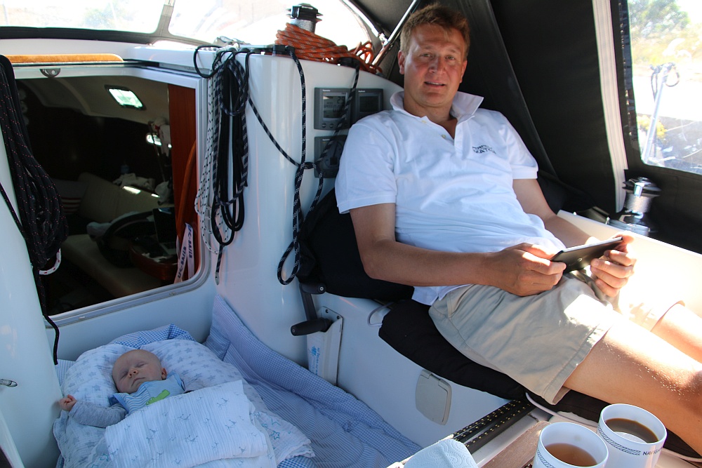 Bei dem Wind und dem kleinen Vorsegel steuert der Autopilot problemlos. Wir sind erstaunt, wie entspannt wir alle drei Wind und Wellen genießen. Bei Bülk bekommt Finn dann seine erste Mahlzeit auf See – Wind und Welle können weder Finn noch mir etwas anhaben.