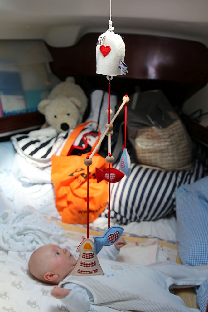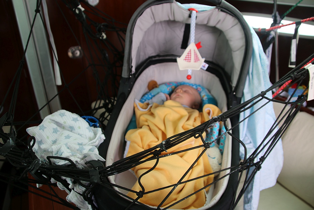 Finns Babywanne haben wir zu diesem Zweck in einem Gepäcknetz unter die Salondecke gehängt (= kardanische Aufhängung). An dieser Stelle ein herzliches Dankeschön an Tine und Kay von Tabaluga, die uns das Gepäcknetz inkl. Zubehörutensilien und Einweisung zur Verfügung gestellt haben.