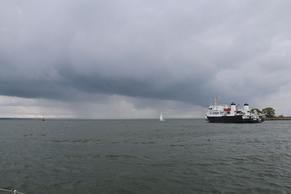 Wir entschließen uns zurück nach Laboe zu segeln, denn die Windrichtung ist günstig, so dass und (und Finn) die Boen nichts anhaben können.