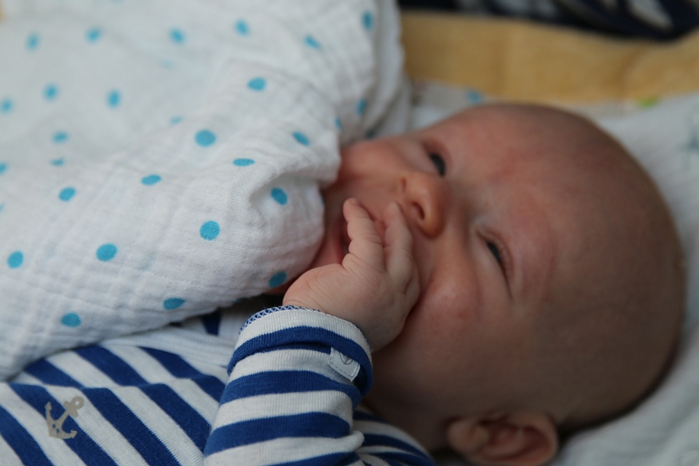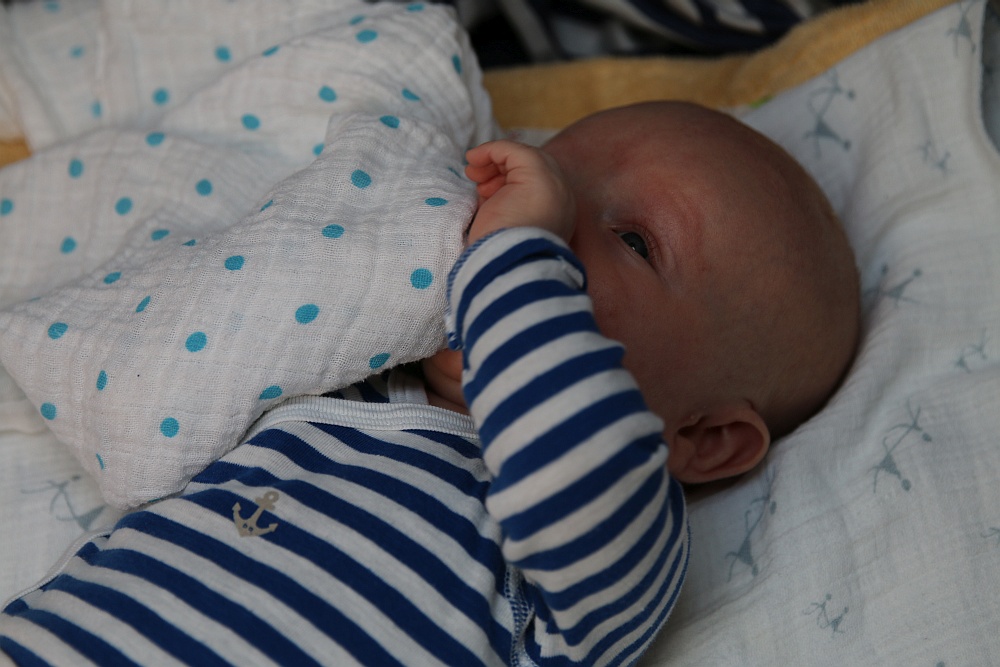 Finn startet im Alter von 7 Wochen mit einem Gewicht von 4.960g und der Kleidergröße 56 in unseren Segelsommer.