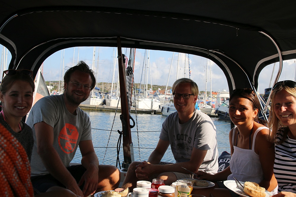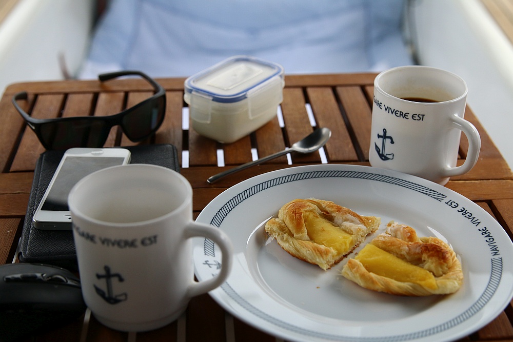 Unser kleines Schiff hat ein extrem gemütliches Cockpit und spätestens als Lars den Milchkaffee mit Milchschaumhaube serviert war die Begeisterung auf ihrem Höhepunkt.