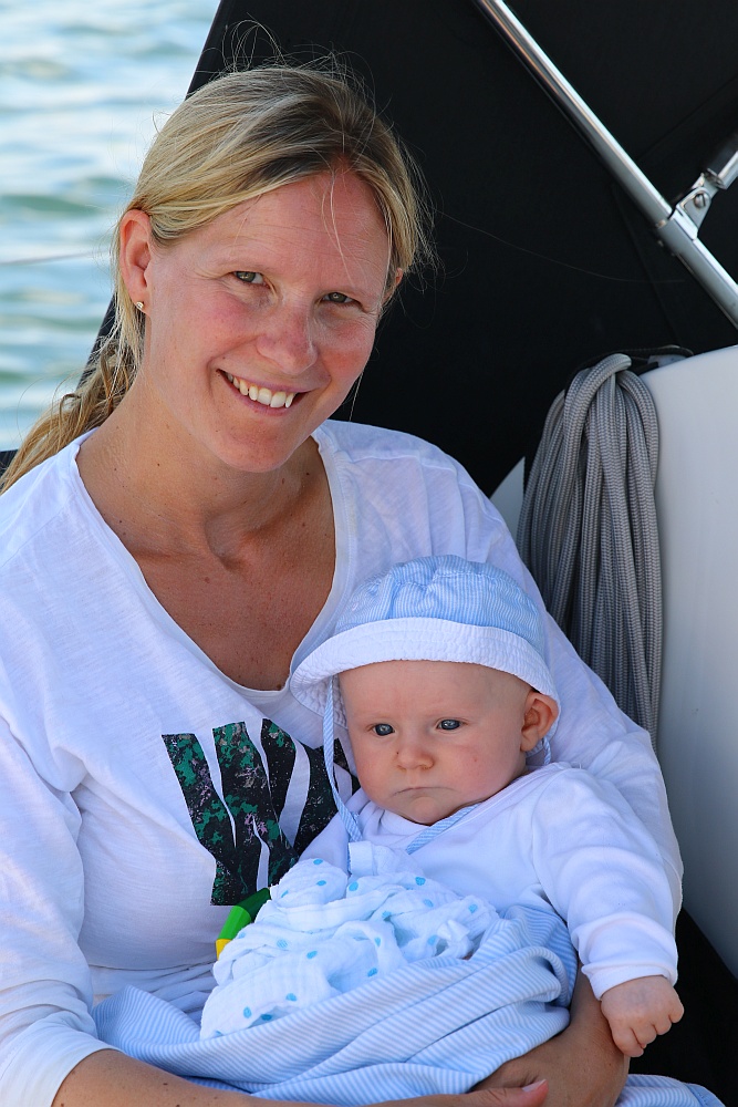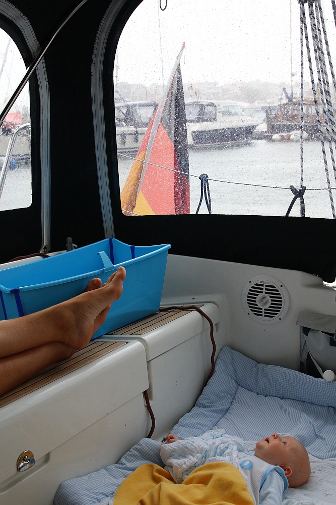 Finn ist heute ab und zu wach und möchte häufiger auf den Arm. Der Wind hat sich auch noch nicht durchgesetzt, daher steht unser Ziel schnell fest: Wir motoren nur noch eine kurze Strecke und werden in Damp festmachen. Zeit für Erholung und ausgibiges Spielen und Kuscheln mit Finn…