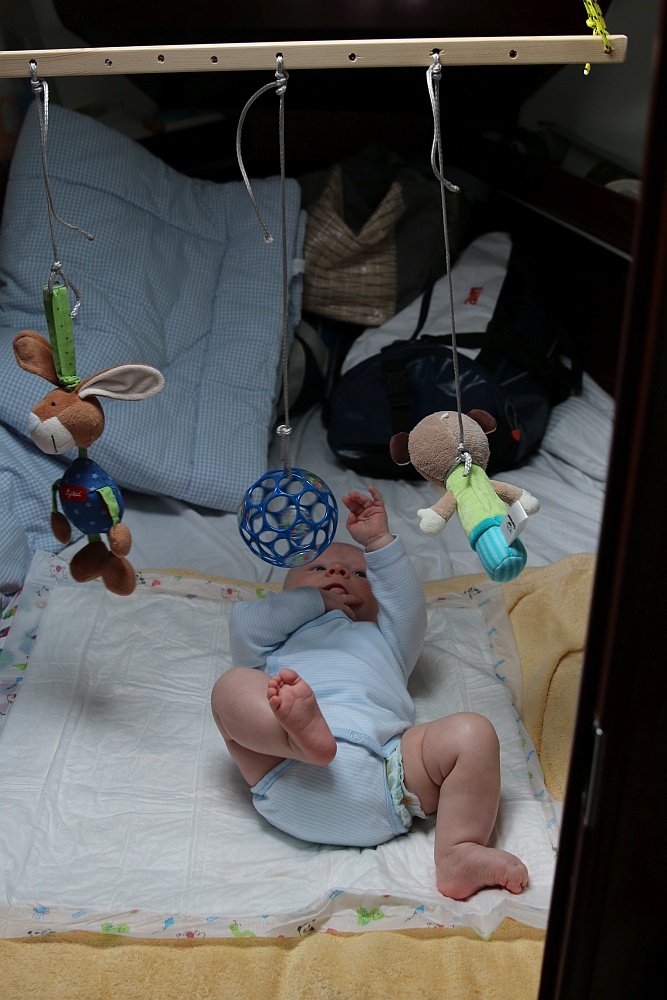 Nach einiger Zeit müssen wir Finn das Activity Center immer mal wegnehmen, da das Spielen so viel Konzentration erfordert, dass er müde wird. Er fängt dann an zu quängeln, kann aber unter dem Activity Center nicht schlafen, weil es ja so spannend ist.