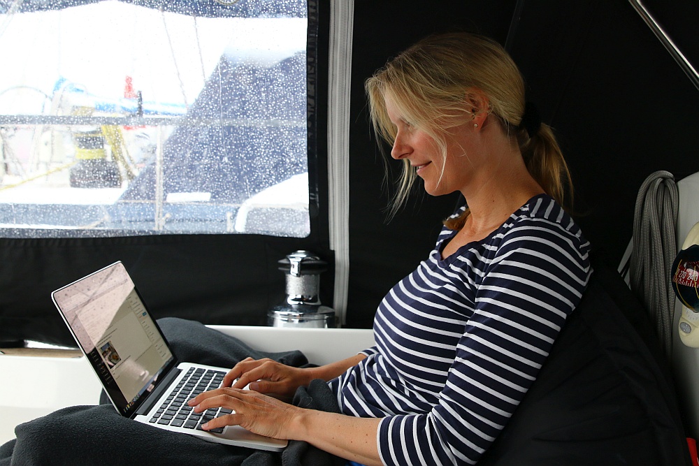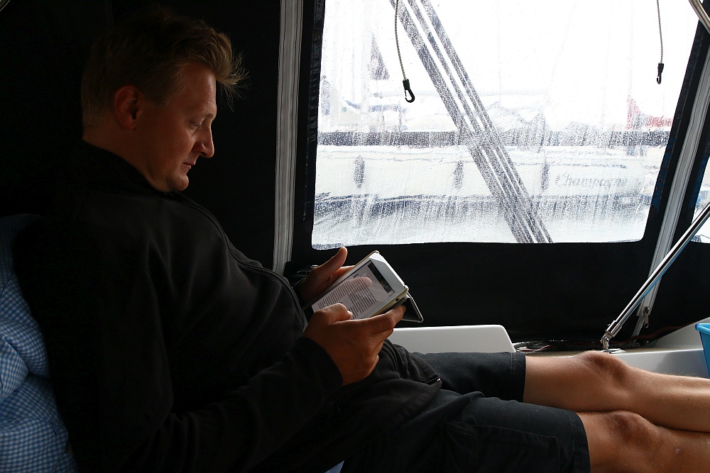 Wir sitzen gemütlich in unserer Kuchenbude und hörem dem Plätschern des Regens zu. Lars liest die Yacht, ich bearbeite meine Post und schreibe den Blog.